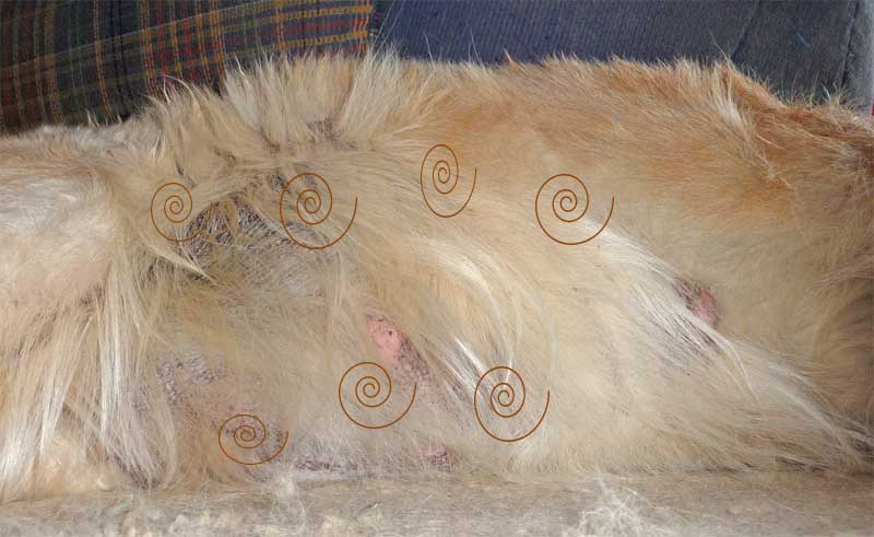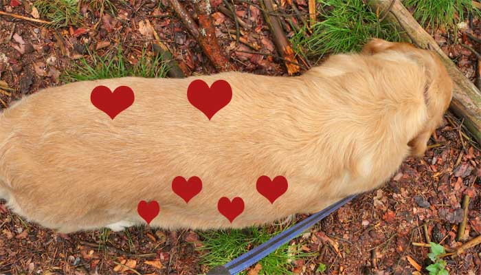 Die Haare am Bauch der Hündin fallen aus. Die Zitzen schwellen weiter an. Die Knochen verstärken sich. |