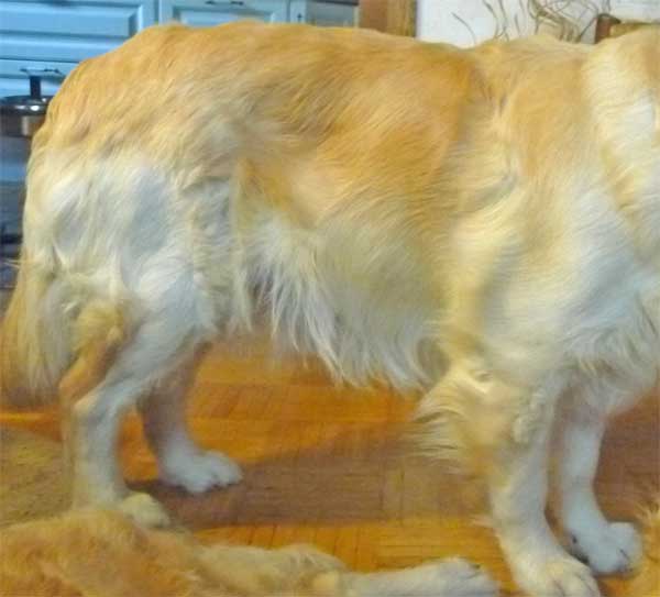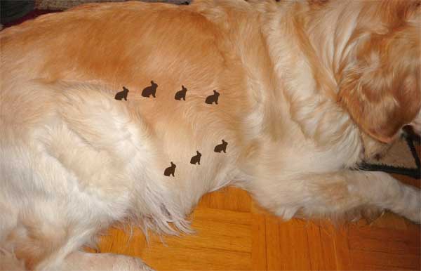 ![]() Die Bewegung der Welpen im Mutterleib ist leicht erkennbar, wenn man die flache Hand vorsichtig auf den Bauch der Hündin legt. |