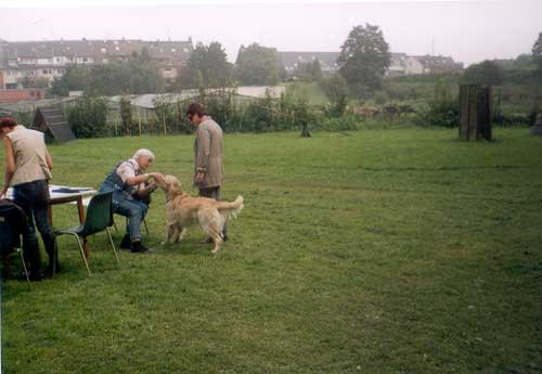 Formwert in Düsseldorf Angelika und Conni haben mit Philipp und Filimon bei der Zuchtzulassungsprüfung ein V bekommen. Die Gesamtbeurteilung von Philipp war: Gute Grösse, Vorzüglicher Kopf, maskuliner Ausdruck, sehr gute Anatomie in allen Teilen. Bewegt sich sehr gut. Gepflegtes Haarkleid, gutes Wesen. Die von Filimon lautete: Gute Grösse, gut geschnittener Kopf, maskulin, gute Halslänge, fester Rücken, gute Kruppe, gute Rippenwölbung, gute Schulter, Front, Hinterhand. Bewegung vorn etwas pfoteneng. Die Richterin war Fr. Assenmacher-Feyel. |