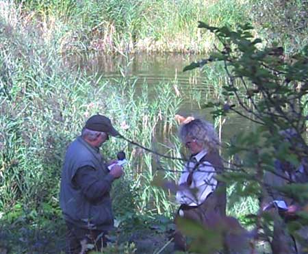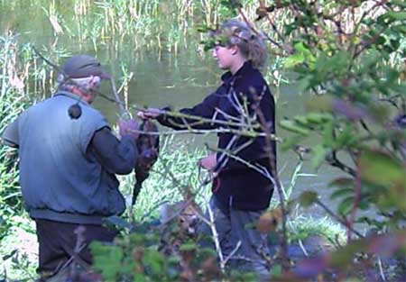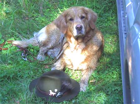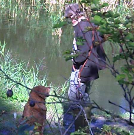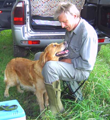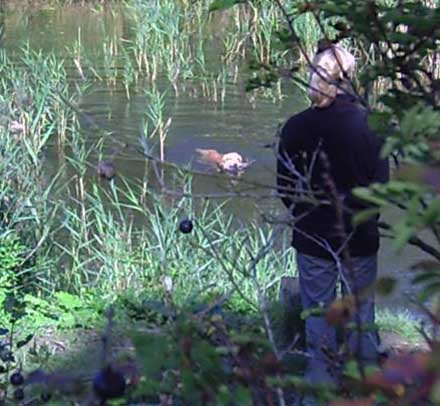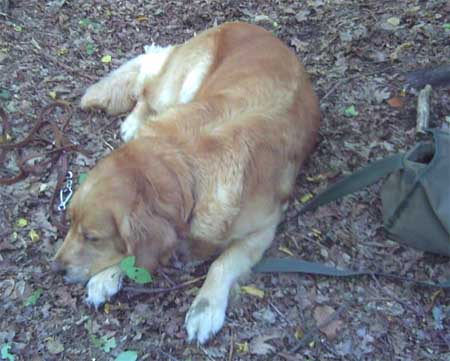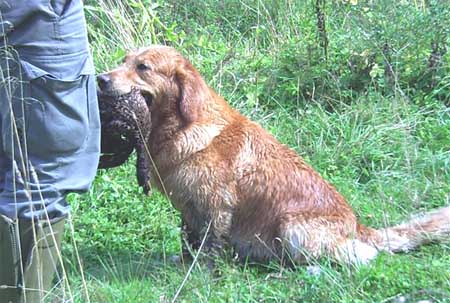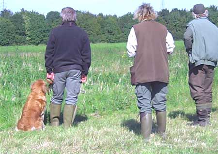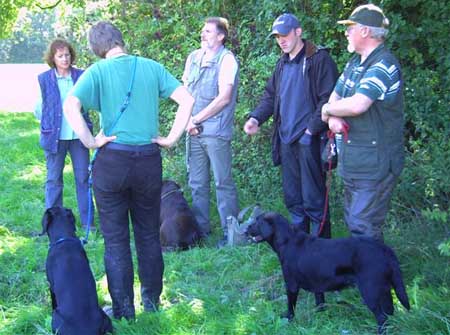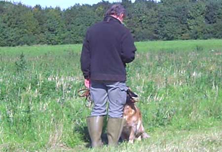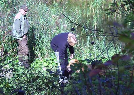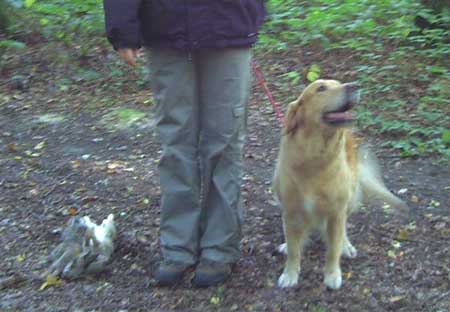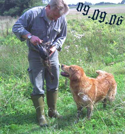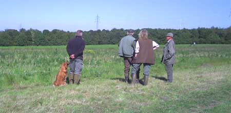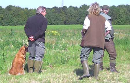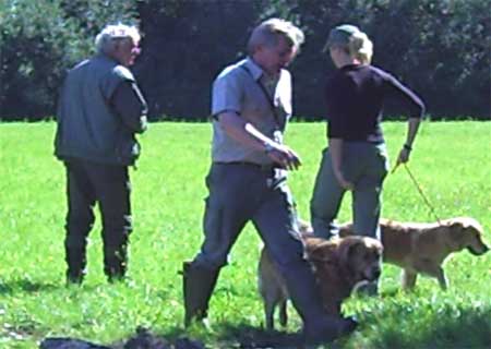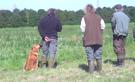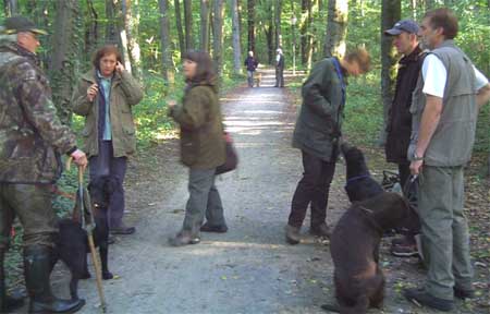Emmi hatte die Startnummer 1 und schoss auch sofort mit überschäumendem Temperament ab – leider verlor sie dabei nach kurzer Zeit die Schleppe „aus der Nase“. Das machte ein zweites Ansetzen erforderlich und kostete Punkte, aber noch viel mehr Nerven bei Jürgen. Ela meisterte ihre Aufgabe souverän und auch die anderen 3 Teilnehmer waren froh, diese erste Hürde genommen zu haben. Weiter ging es anschließend mit der Verlorensuche auf 2 Stück Haarwild. Hier war Emmi natürlich voll in ihrem Element. Schnell waren beide Kaninchen gefunden und sie fand zwischendurch noch die Zeit, eine riesige Baumwurzel zu verbellen. Während sie danach ein kurzes Nickerchen einlegte, zeigten Julia und Ela, dass sie mit diesem Prüfungsfach auch keinerlei Probleme hatten.