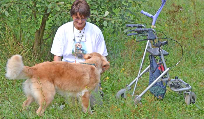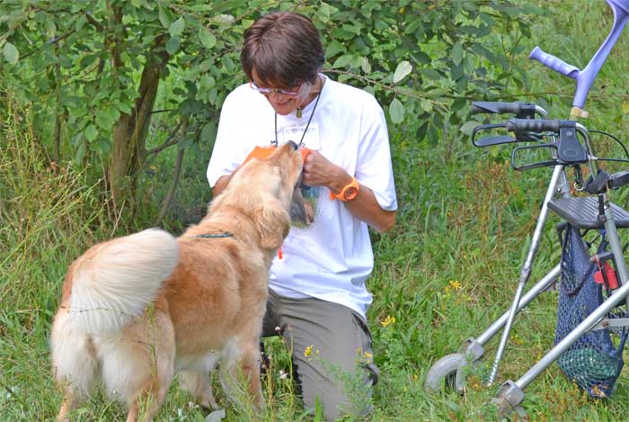 Meine Mitstreiter hatten große Schwierigkeiten ihre Hunde aus dem Suchengebiet zu bekommen, aber meine Schnecke lief und als sie das Tempo etwas drosselte bekam sie von mir nochmal ein voran und dann habe ich sie im Stich gelassen. Ich hätte sie jetzt nur noch abpfeifen und nach rechts, schicken müssen, aber just in diesem Moment ein Blackout bei mir, als sie wieder etwas zurück kam stoppte ich sie, schickte sie back was sie auch sofort tat und ich konnte den Suchenpfiff geben . Jetzt war es für sie kein Problem mehr, die Nase ging runter und das Blind war schnell gefunden. Von unserer so tollen Teamarbeit konnte man dadurch nicht viel sehen. Das letzte Fach stand an - Walk up . Das Gebiet, was wir dafür nutzten war mit Hasenlöchern gespickt wie ein Schweizer Käse. Auf Grund dieser Tatsache musste ich den Rollator stehen lassen, ich hatte Angst um meine Schnecke, das mir auch was passieren könnte, nö auf die Idee kam ich gar nicht. Wenn ich doch jetzt eine Planierraupe zur Hand hätte dann könnte ich ..... .Ich durfte das Tempo angeben und prompt trat ich in ein Loch. Ondra saß jetzt nicht mehr ganz nah bei mir, aber weil sie so konzentriert war habe ich sie sitzen lassen, was uns wieder Punkte kostete, aber was soll´s, ändern konnte ich nichts mehr daran. Dann Stellungswechsel. Wir waren an der Reihe. Als ich die Freigabe für Ondra bekam sauste sie los hatte schnell das Dummy aufgenommen und stolperte auf den letzten Meter auch in ein Loch. Trotz meines Erschreckens hielt sie das Dummy fest und gab es mir stolz. Es war ihr nichts passiert. Da die L/H eingesprungen war, brauchte sie das Fach nicht mehr abarbeiten und die Prüfung war beendet.