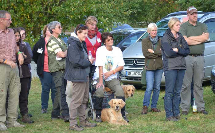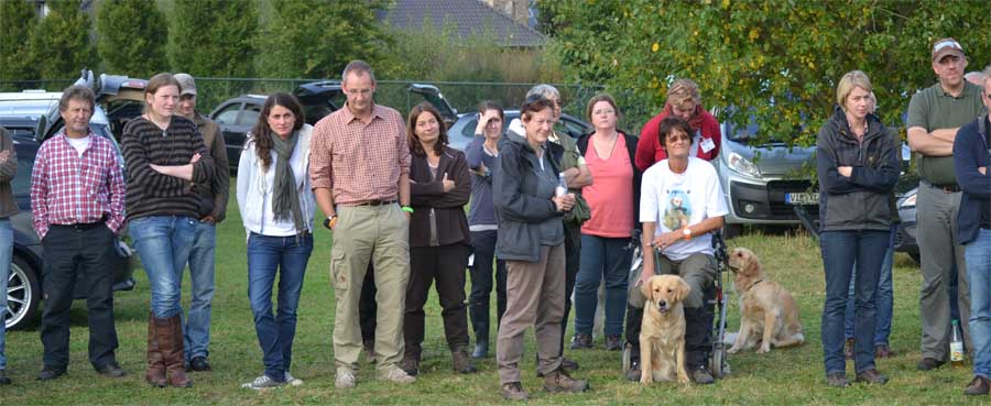 Sie arbeitete das Landdummy sehr zügig und ich schickte sie ins Wasser. Zu meiner Überraschung sprang sie nicht wie eine Irre hinein, sondern ganz gemach holte sie mir das Dummy. Das Fach hatten wir schon mal geschafft. Dann kam die Verlorensuche. Thomas Kühn bestand auf 5 Dummy`s. Gespann 1 scheiterte an diesem Fach und es waren nur noch die beiden Mädels im Rennen . |