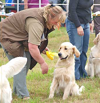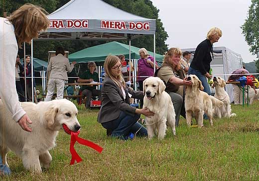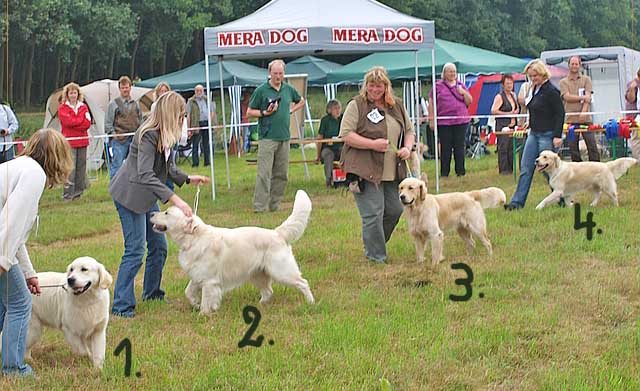 Der Richterbericht: sweet head, excellent pigment, good reach of neck but upright in shoulder, lacks substance overall, slopes away over croup and straight in stifles, a very happpy dog, nicely handled |
