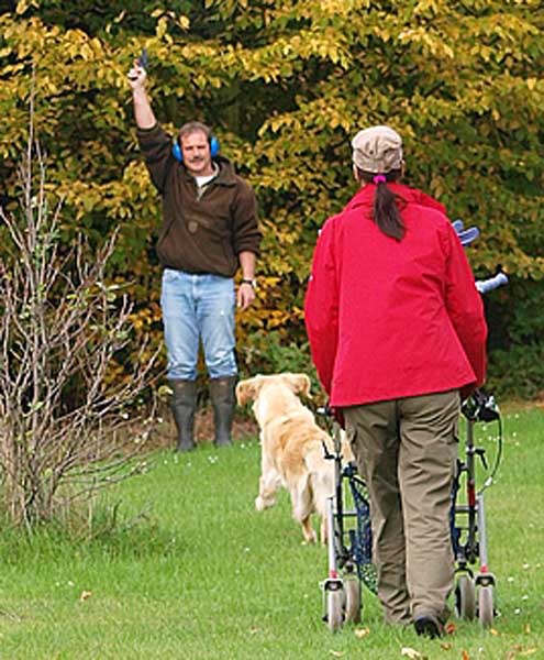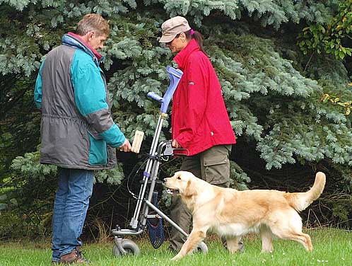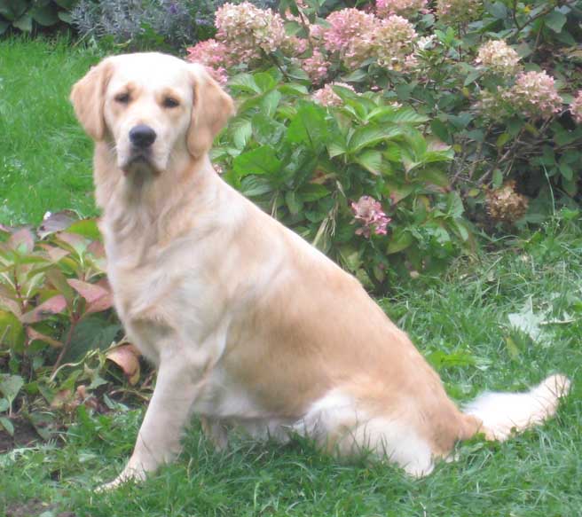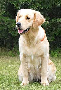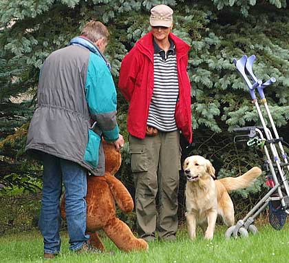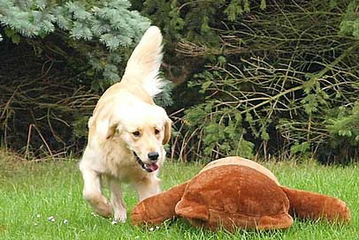 ![]() Ondra von Tobi's golden Lana Die 16 Monate alte Golden - Hündin zeigte ein sehr gutes Bewegungsverhalten. Im gesamten Testverlauf verhielt sie sich sehr aufmerksam und zeigte eine enge Bindung. Das Spielverhalten ist gut sichtbar geworden. Sie zeigt ein starkes Beuteverhalten. Im Umgang mit Fremdpersonen absolut freundlich und sicher. Sie zeigt eine starke Unterordnungsbereitschaft. Bei der Gasse und in der Seitenlage ist sie belastbar. Im optischen und akustischen Bereich im allgemeinen sicher. Die Hündin ist schussfest. |