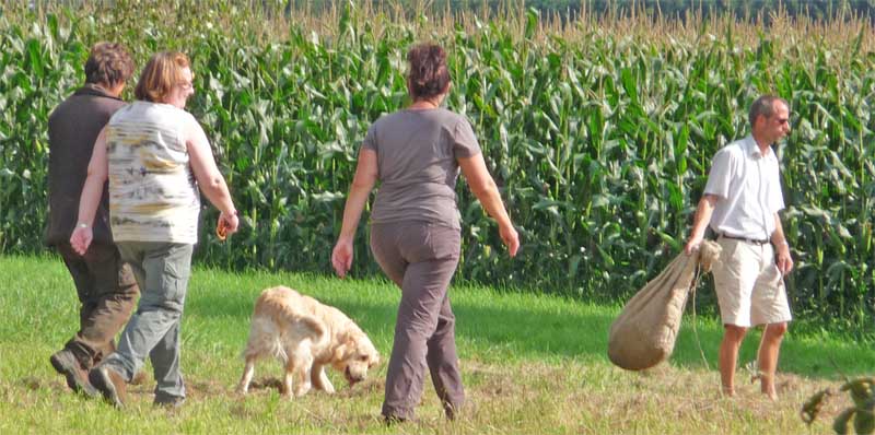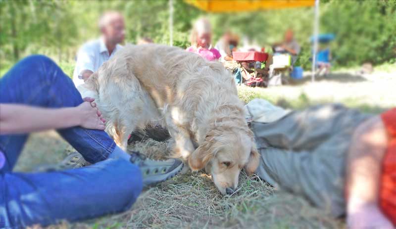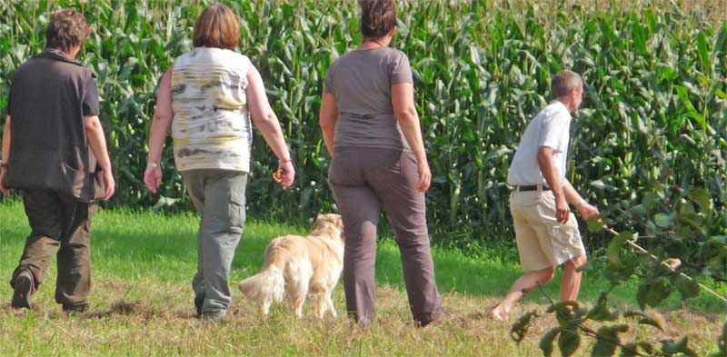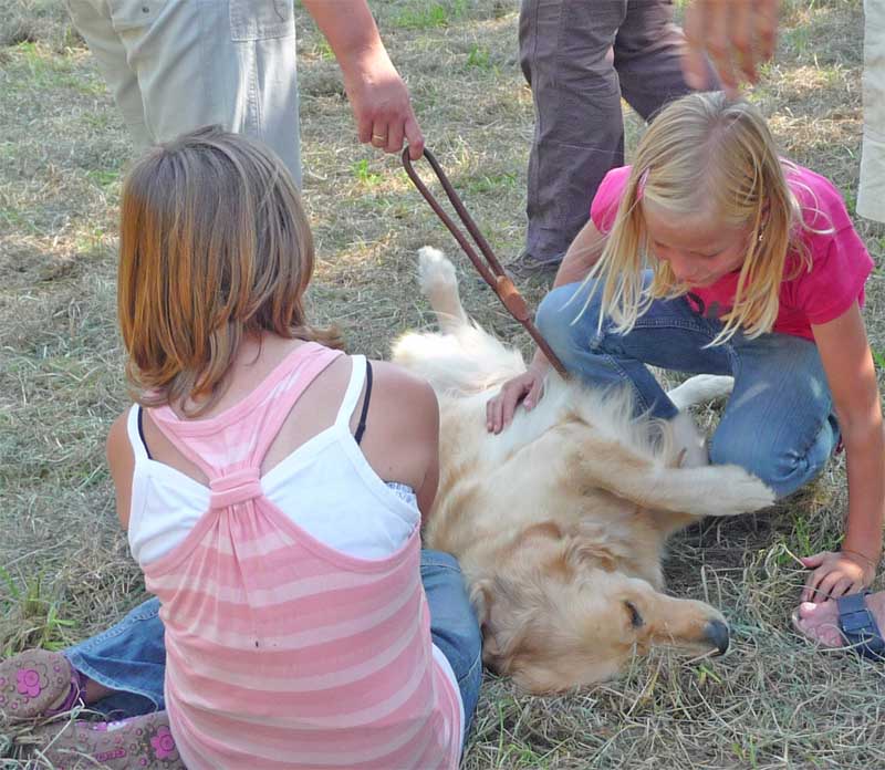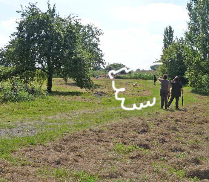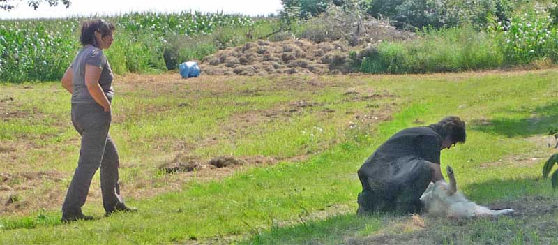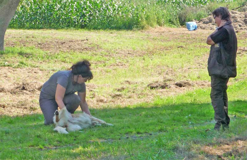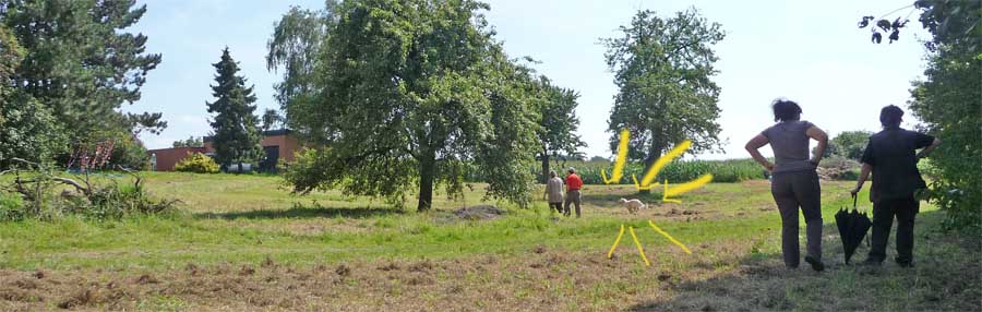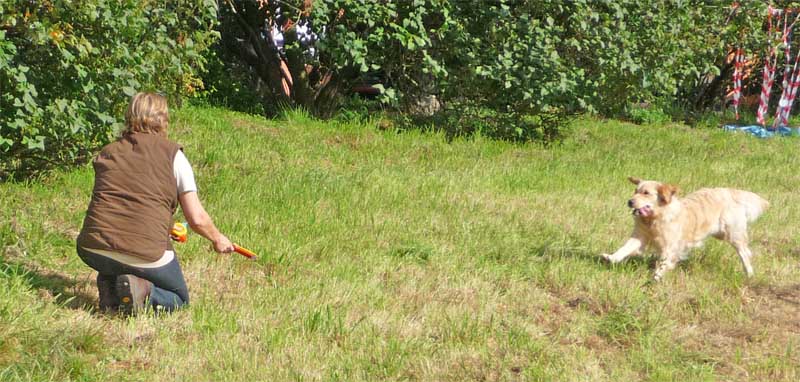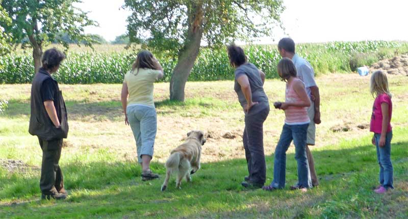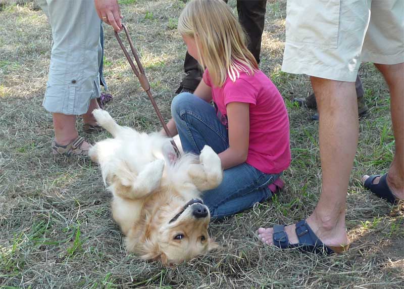 Leider wurde meine Zwischenmahlzeit unterbrochen und ich musste an der Leine ein ganzes Stück laufen. Da waren keine Birnen mehr, schade. Dafür knallte es da mächtig und da war noch ein Mensch, der von mir geküsst werden wollte, hab ich natürlich gemacht und alle waren erfreut. Die eine Frau und Christian haben schön mit mir gespielt. Zur Belohnung durfte ich mich hinlegen und bekam auch noch den Bauch gekrault, himmlisch….