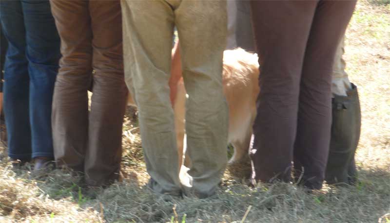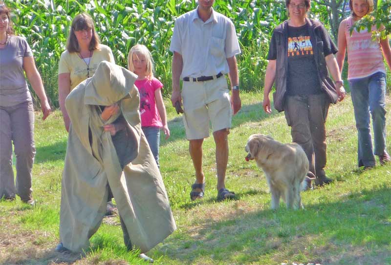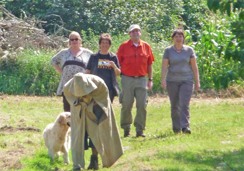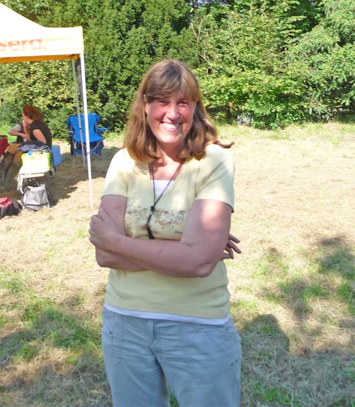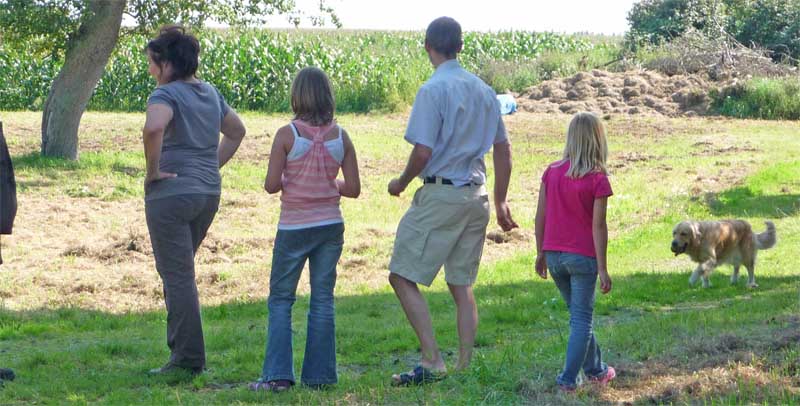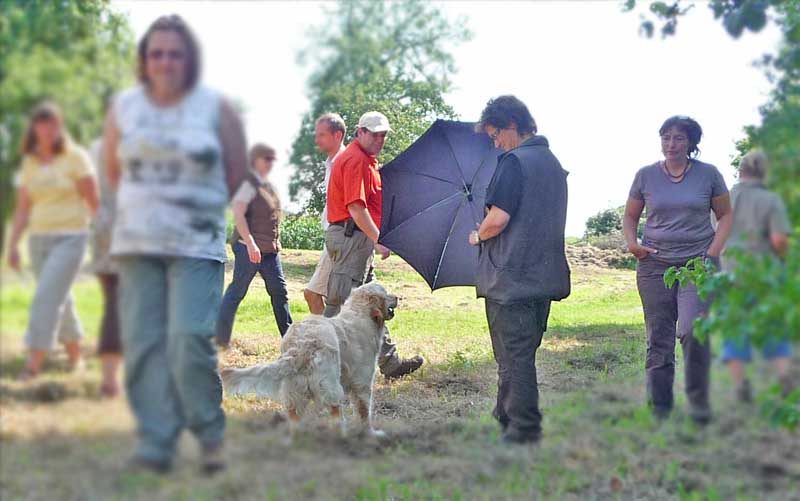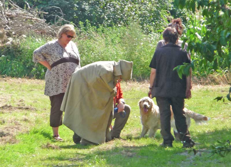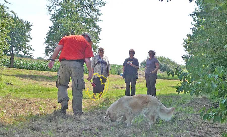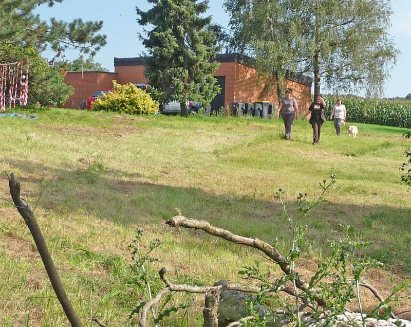 Leider wurde meine Zwischenmahlzeit unterbrochen und ich musste an der Leine ein ganzes Stück laufen. Da waren keine Birnen mehr, schade. Dafür knallte es da mächtig und da war noch ein Mensch, der von mir geküsst werden wollte, hab ich natürlich gemacht und alle waren erfreut. Die eine Frau und Christian haben schön mit mir gespielt. Zur Belohnung durfte ich mich hinlegen und bekam auch noch den Bauch gekrault, himmlisch….