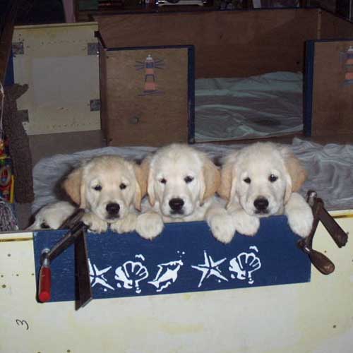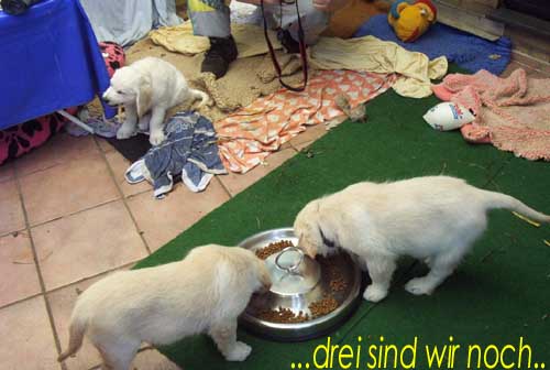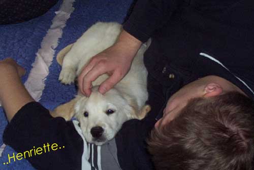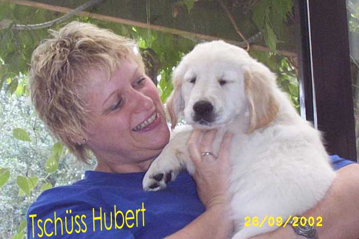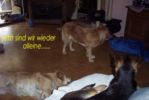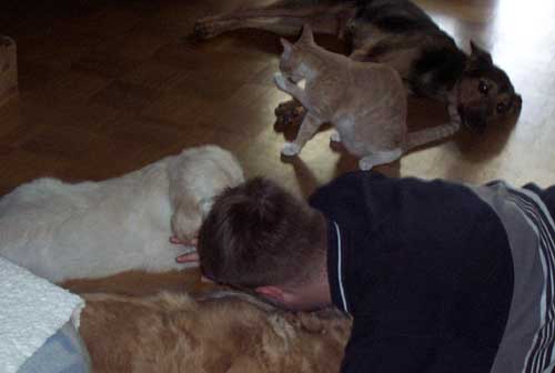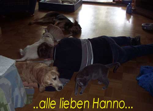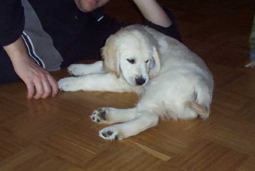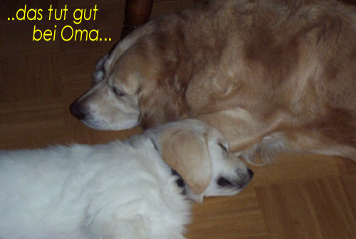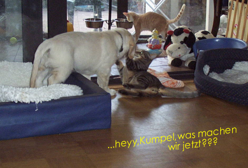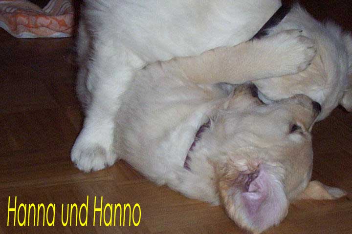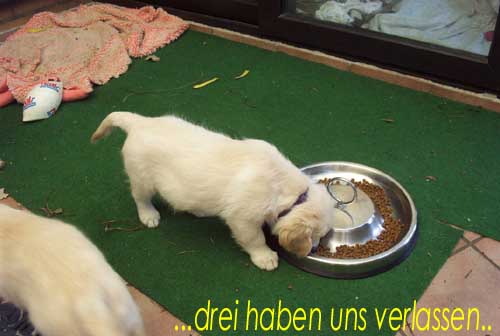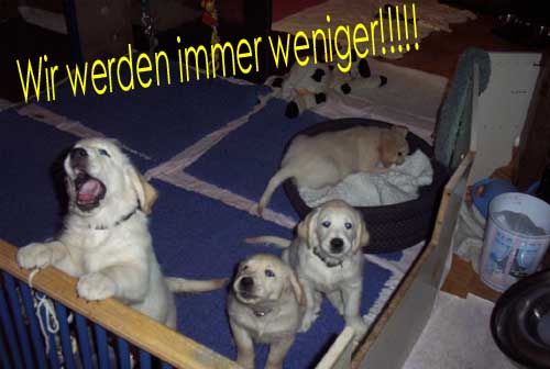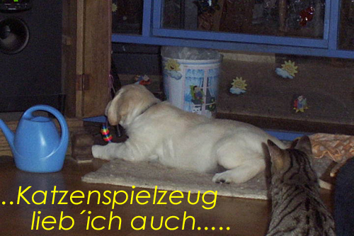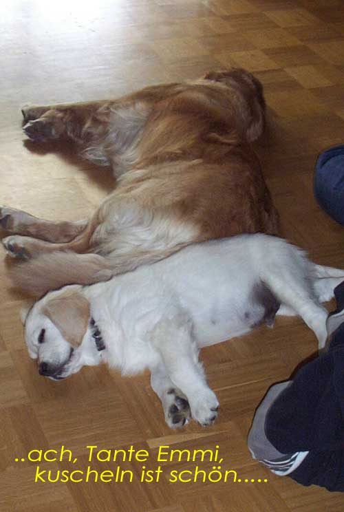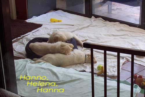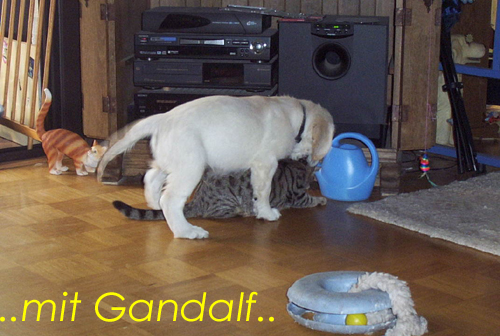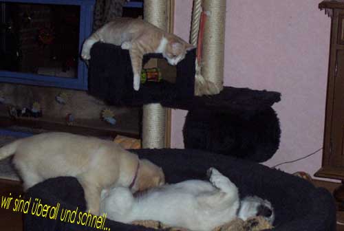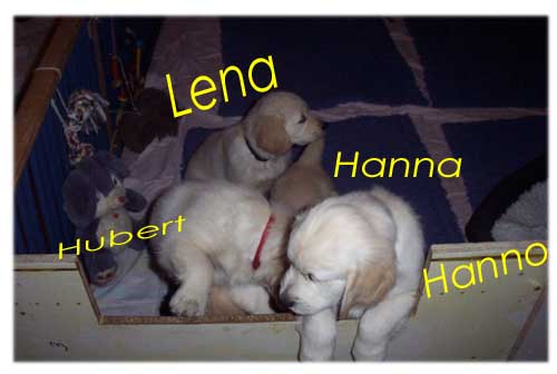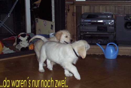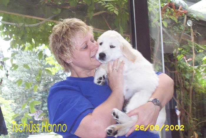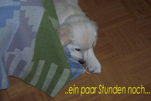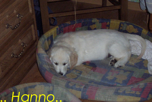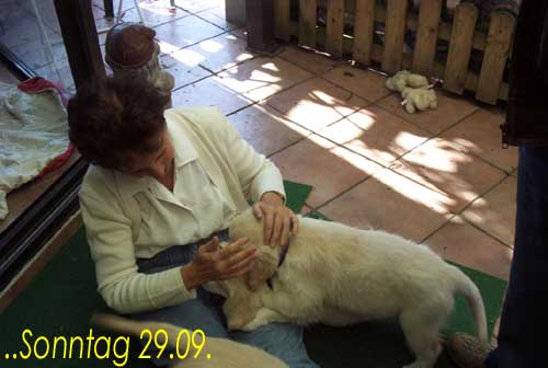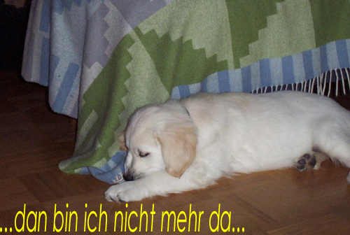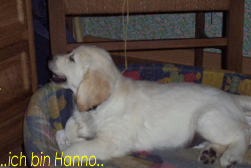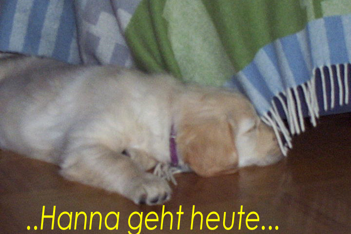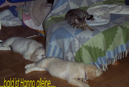 Am 27.09. verließen die ersten Püppys mit ihren strahlenden Besitzern unser Nest. Da ich Samstag mit Julia auf einer Prüfung war, wurden Hubert und Helena erst am Sonntag (29.09.) abgeholt. Hanno blieb noch bis Dienstag hier. Doch er hatte ja drei Kameraden, die Kater, besonders Gandalf fand es toll, mit ihm durchs Wohnzimmer zu toben. Auch waren noch Oma nebst Tante da. Ich nahm ihn dann kurzer Hand zum Schlafen, wie es sein soll, mit ins Schlafzimmer. Da war er selig und schlief tief und fest bis zum anderen Morgen. |