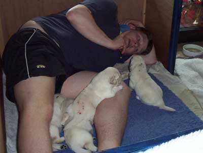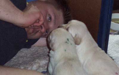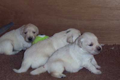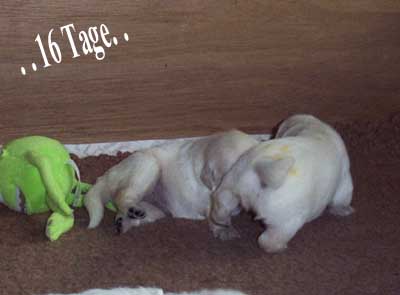 | Nachdem die zweite Woche so traurig endete, ist es in der dritten Woche um so schöner zu sehen wie die Kleinen sich entwickeln. Sie sind schnell und können wie große Hunde schon bellen und knurren. Außerdem Spielen sie schon untereinander wie ein altes Hunderudel. Ihre Zähnchen sind so langsam auch da. Bald schmerzt es wieder an den Zehen, wenn man durch ihr Revier laufen möchte. Sie sind sooooo süß und Knuffig. Es ist die Woche in der Ihre Besitzer ihre kleinen Herzchen das erste mal Live sehen und drücken dürfen. Da es sehr lebendige Welpen sind mussten wir den Kindergarten schon nach 18 Tagen aufbauen. |