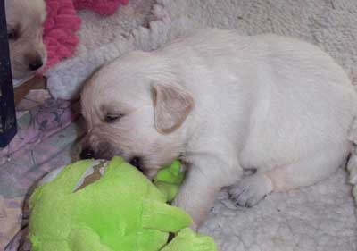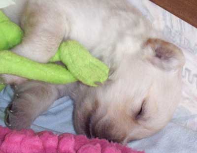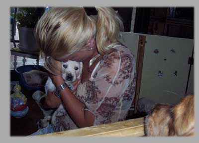 Am 4.6. kam Gabi ihren Manu besuchen. Mit 22 Tage kann man einen Rüden noch mit einer Hand im Arm halten. Bald wird das nicht mehr so einfach sein.