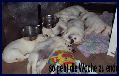 Jeden Sonntag wagte sich Susanne in das Revier der Kleinen. Es war meistens ein recht hartes Geschäft die kleinen Raketen vor die Linse zu bekommen. Wir werden die Sonntage vermissen, wo Uwe und Susanne zu uns kamen und wir schöne Stunden bei den Kleinen verbrachten. Als sie noch eine Woche alt waren konnte man sich viel Zeit lassen zum Bilder machen. Später dann war es meist ein "dreckiger" Job, doch es machte ihr und uns immer sehr viel Spaß. Wir freuen uns schon auf den nächsten Wurf, dann folgt ein neuer Schwierigkeitsgrad. |