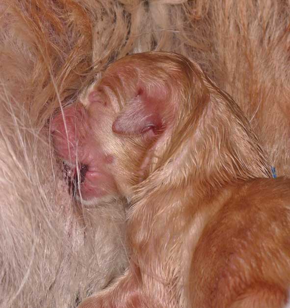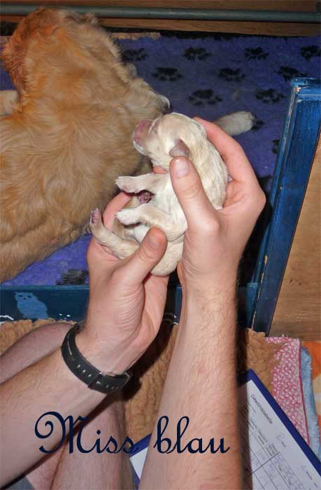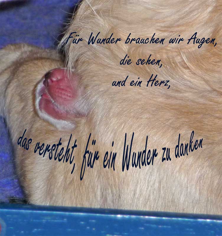 | Da waren sie, die zarten kleinen Wesen. Wieder ein Wunder. Imogen meinte es mit meiner Freundin Uli van Laak sehr gut, denn ihr schenkte Mogi einem kleinen Prinzen das Leben. Es sollte der einzige Prinz bleiben. --- Glück gehabt --- Uli. --- Wie schrieb Gabi Spieß so schön in mein Gästebuch. "Du wirst sehen, dein Quoten-Bub wird sich gegen die Weibersleut behaupten können. Nichts schöneres als ein von vielen Schwestern geprägter Bube. Das wird ein sanfter Frauenversteher, wirst sehen." Ich glaube Gabi das ist er jetzt schon. Doch schaut unten selbst meine köstlichen Mon Chéri, zart und sooo süß.