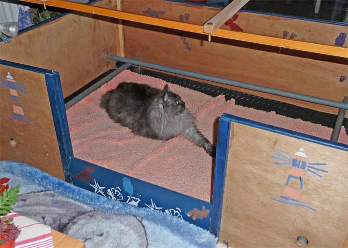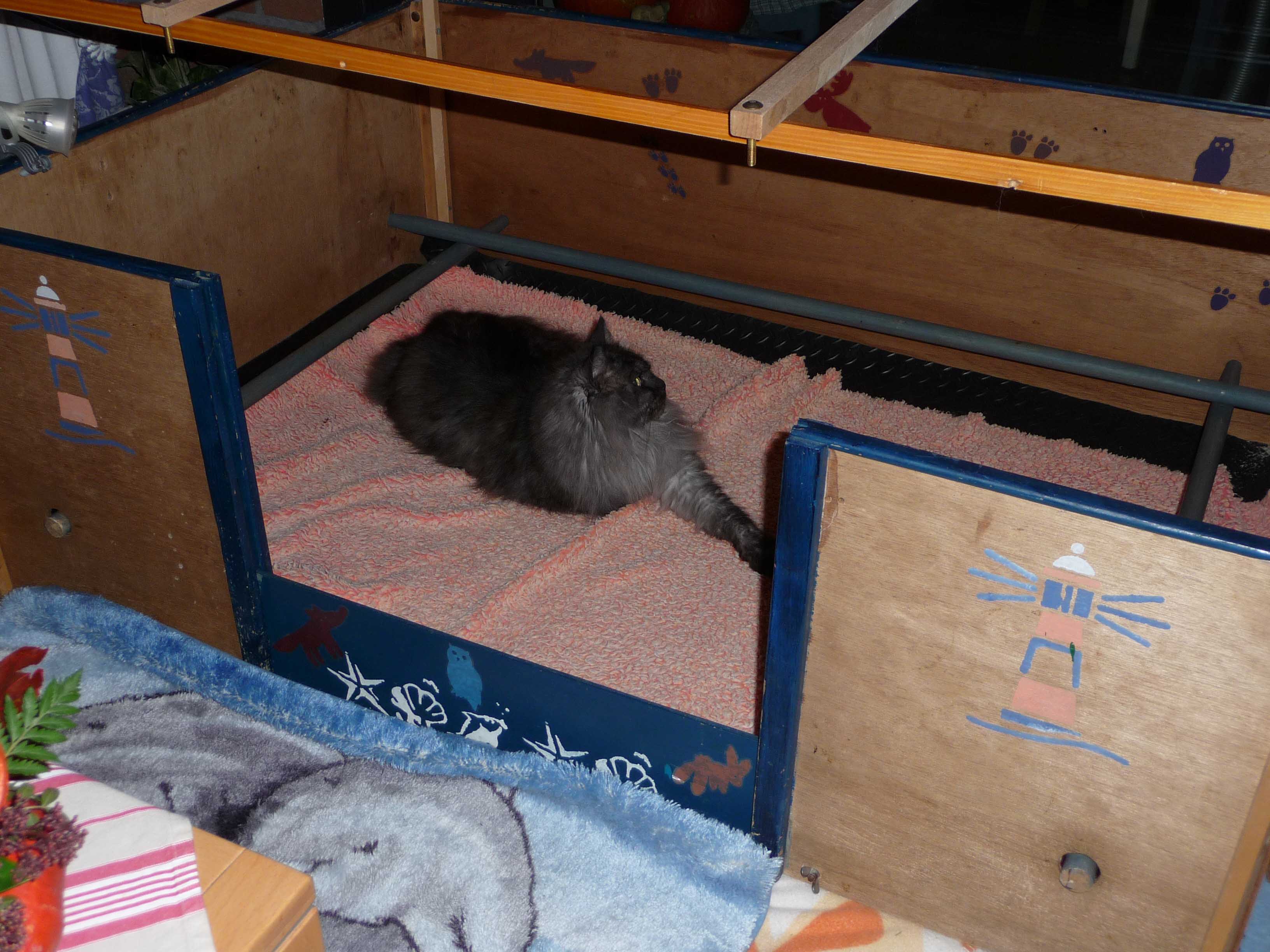 Da nun die Wurfkiste an ihrem "richtigen" Platz steht im Wohnzimmer, wo es ruhig und zugfrei ist, kam sie schon zum Probeliegen, allerdings mit Baldur, unseren Maine Coons. |