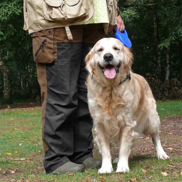 einen Golden Retriever an. |