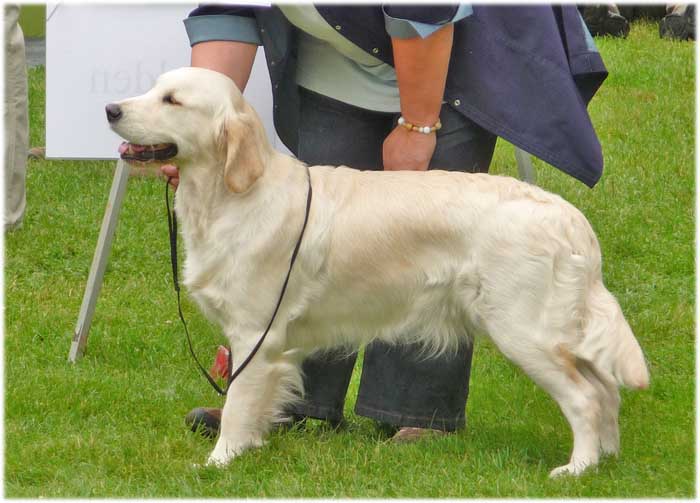 a slightly small bitch, kindly head and good expression, reasonable lay back of shoulder slightly shorter in neck, could do with more bend of stifle, needs time to mature moved reasonably well |